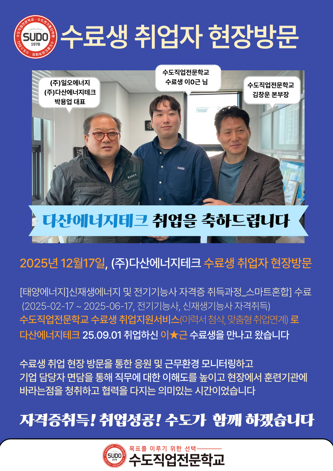 다산에너지테크 25.09.01 취업하신 이★근 수료생을 만나고 왔습니다